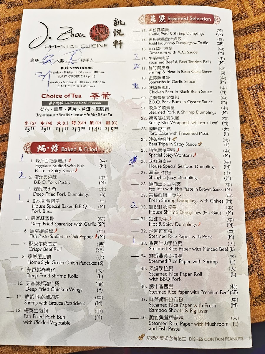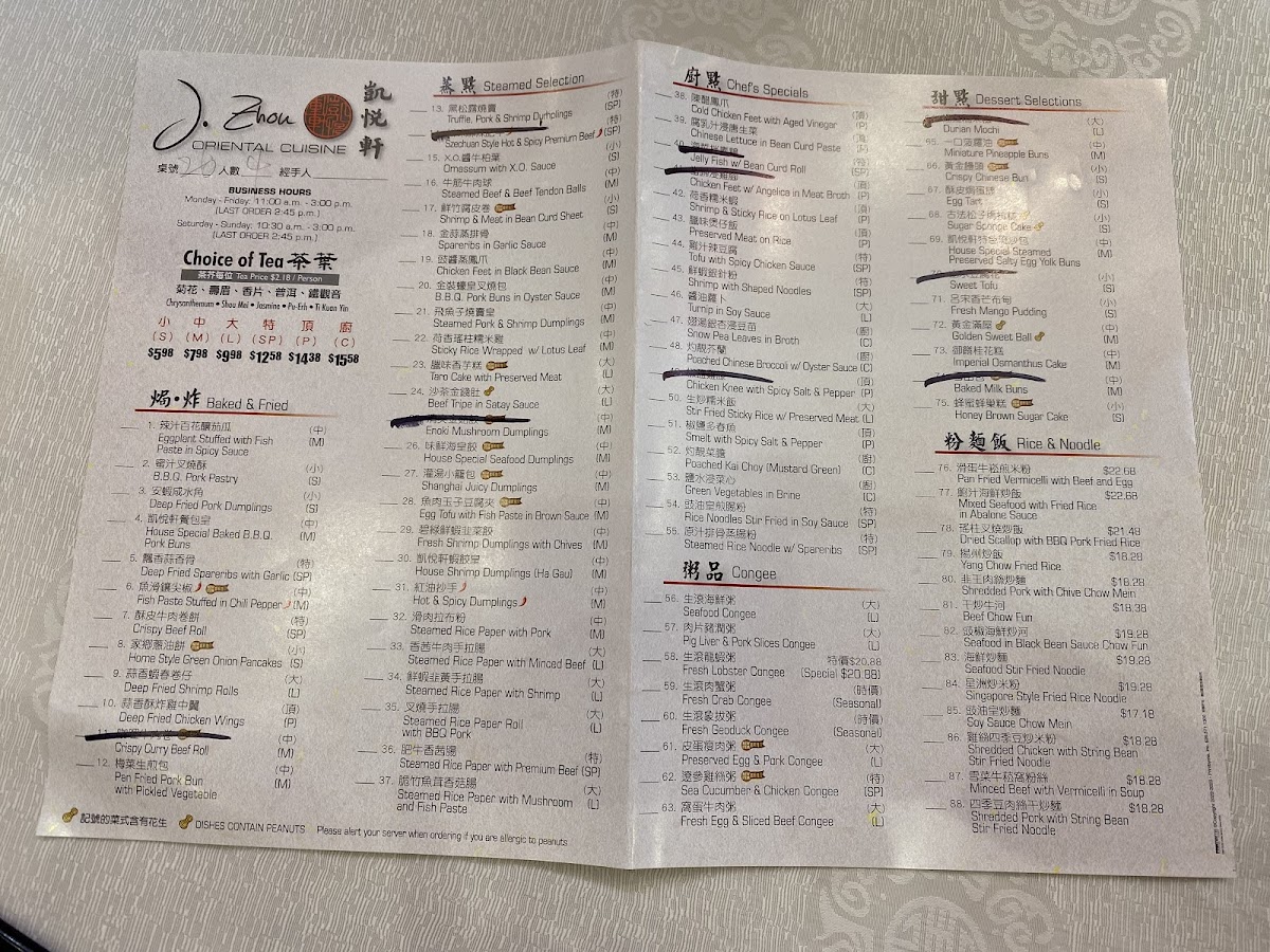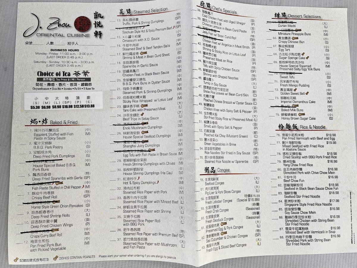 The menu at J Zhou Oriental Cuisine offers a diverse selection of traditional Chinese dishes with a focus on Cantonese cuisine and dim sum specialties. The menu is structured to include a variety of appetizers, barbecue items, soups, main courses, and beverages, allowing guests to choose from light bites to more substantial meals.