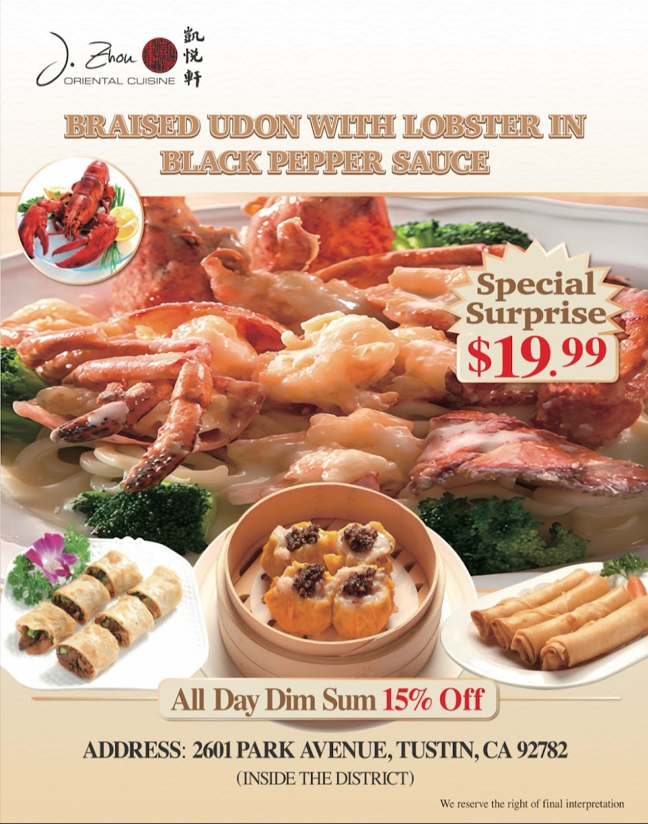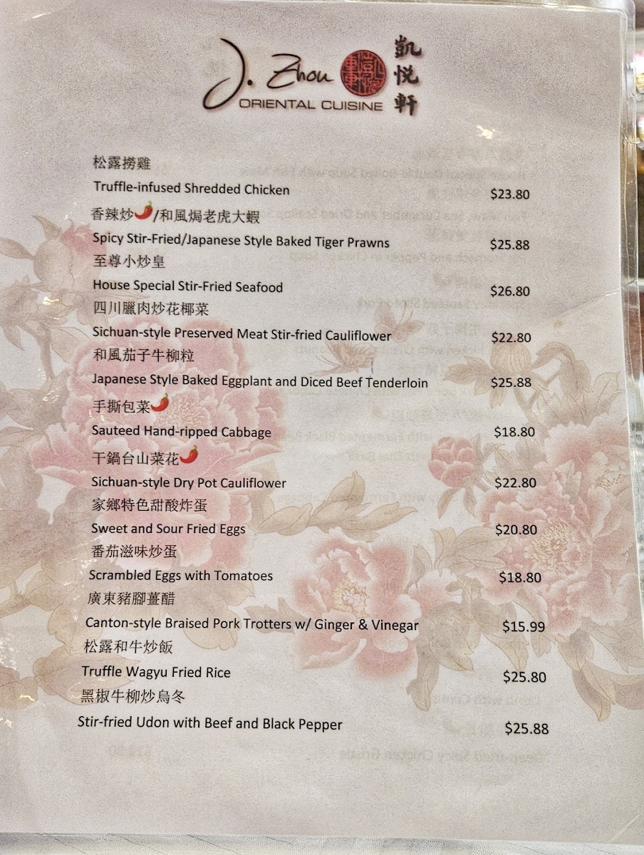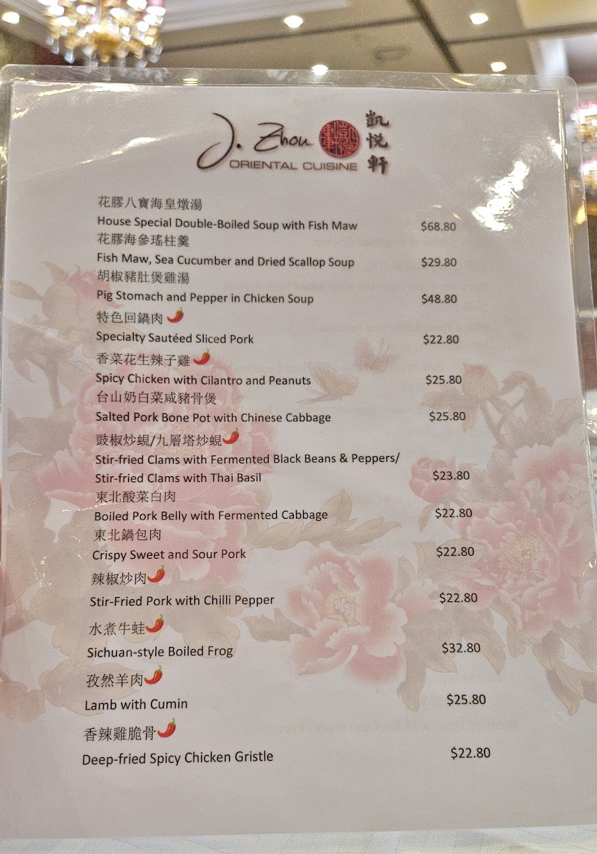The menu at J Zhou Oriental Cuisine offers a diverse selection of traditional Chinese dishes with a focus on Cantonese cuisine and dim sum specialties. The menu is structured to include a variety of appetizers, barbecue items, soups, main courses, and beverages, allowing guests to choose from light bites to more substantial meals.